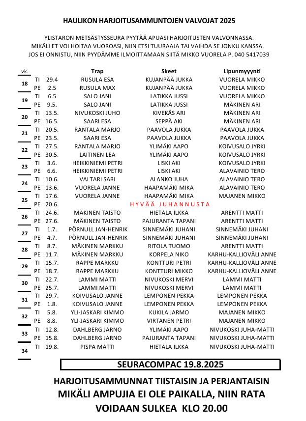 Valvontavuorot 2025Hirviporukoiden valvontavuorot hirviradalla Hööpakan porukan vuorot Kärkimäen porukan vuorot Pukkilan porukan vuorot Aseman porukkan vuorot VALVONTAVUOROT HAULIKKORADOILLA 2025 Tulostettava haulikon valvontavuorolista 2025 Harjoitukset alkaa kello 18.00 ja päättyy 21.00 Paikalla on oltava klo20.00 mennessä. Jos ei ampujia ole paikalla, niin radat suljetaan silloin. Katso myös ammunnanvalvojan tehtävät